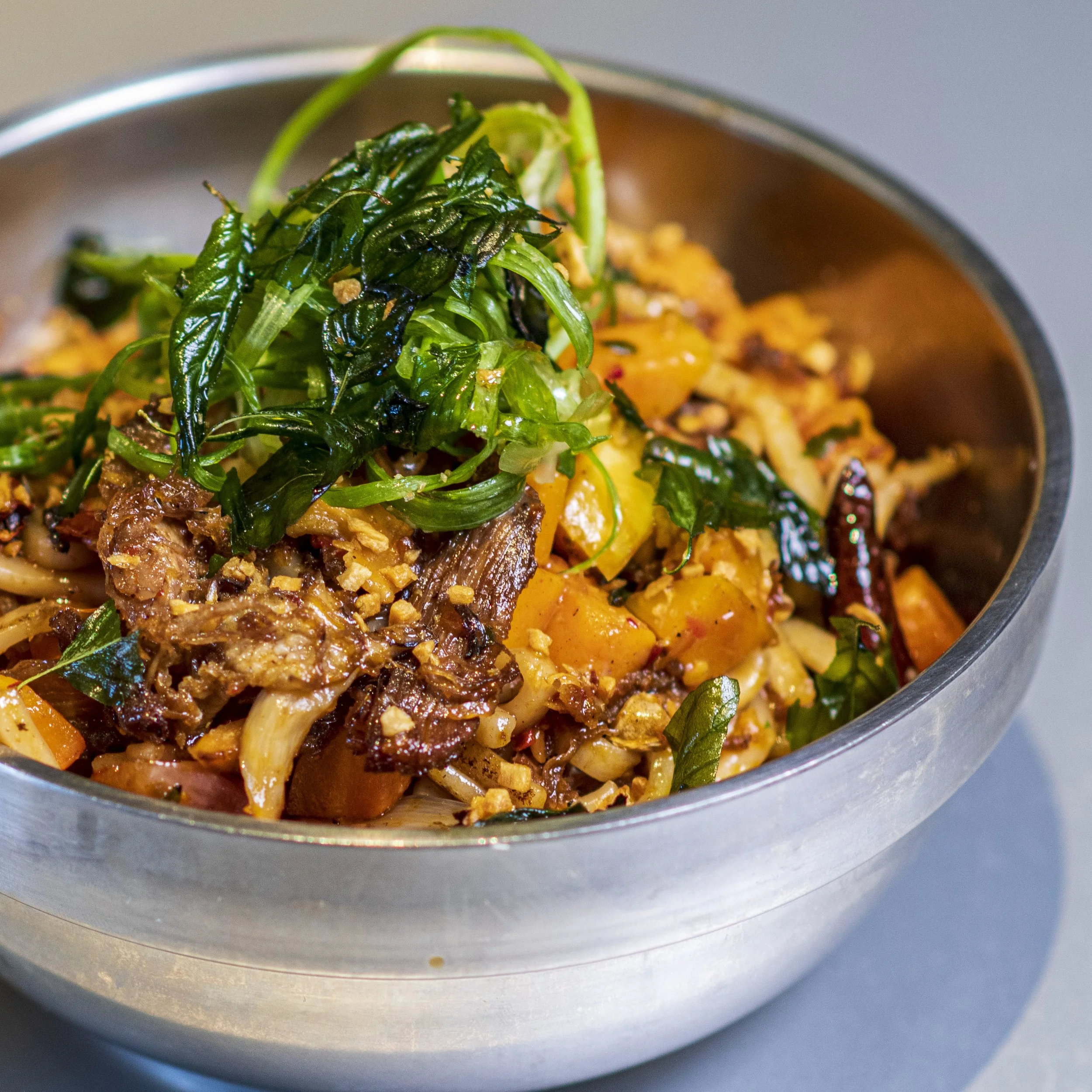 A bold, comforting spin on a guest favorite — rich confit duck paired with bouncy rice cakes.